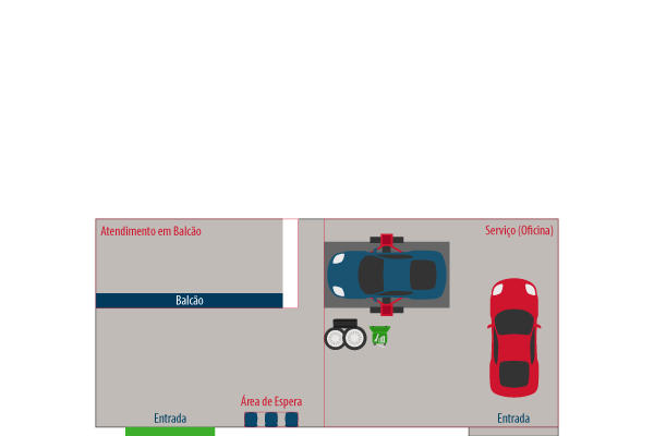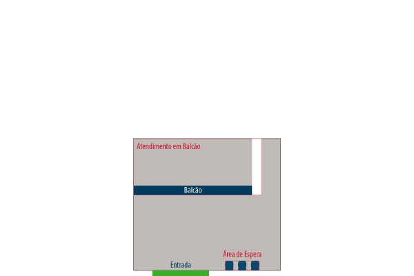 (Banheiro; Área restrita; Estoque; Café e água; Escritório.)