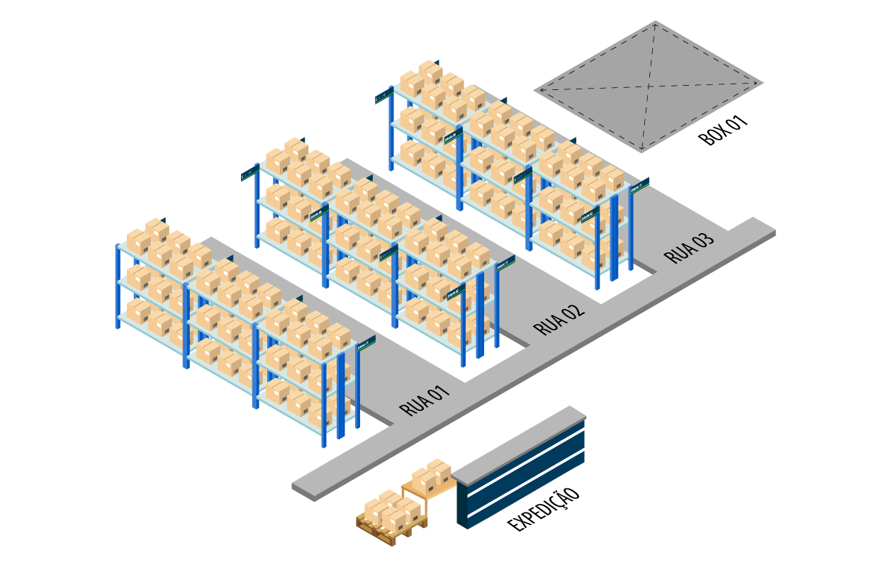 Os corredores do armazém são definidos por numeração sequencial. É importante que a rua 1 fique perto do local em que ocorre o recebimento e o envio de mercadorias, começando de um lado do galpão e terminando do outro.