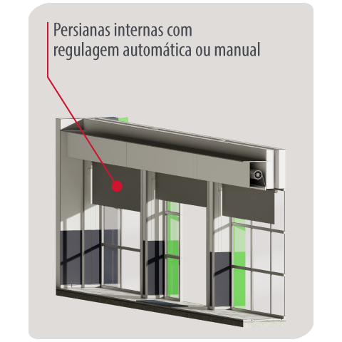 Quando utilizadas, devem ser instaladas internamente, junto aos panos de vidro da fachada, permitindo regulagem da entrada de luz sem impacto visual externo.