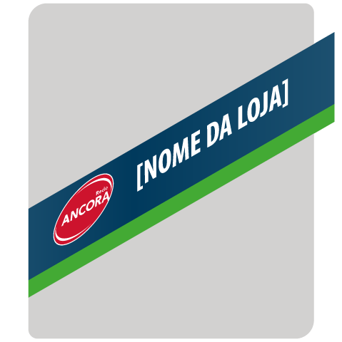 A testeira deve seguir rigorosamente o padrão visual da Rede ANCORA, utilizando o fundo azul institucional com faixa verde na base. O logotipo da Rede ANCORA deve estar posicionado no lado esquerdo, sobrepondo parcialmente a faixa verde. Ao centro, deve ser aplicado o nome ou logotipo da franquia na versão monocromática branca; caso o franqueado opte por não utilizar o logotipo próprio, o nome deve ser escrito com a fonte Myriad Pro Condensed Bold, com a primeira letra maiúscula e as demais minúsculas. No lado direito, deve constar a linha de atuação da franquia (“AUTOPEÇAS” e/ou “PEÇAS DIESEL”), sempre em Myriad Pro Condensed Regular, com letras maiúsculas. Todos os elementos devem estar centralizados horizontalmente, respeitando as proporções e alinhamentos definidos para a marca.