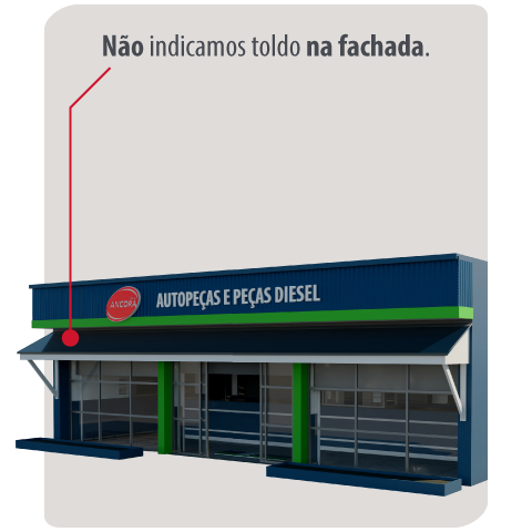 A Rede ANCORA recomenda que o controle da iluminação seja realizado exclusivamente por soluções internas, preservando integralmente a fachada externa. O uso de toldos não é indicado, pois pode interferir na visualização do pórtico, da testeira e da identidade visual da loja.