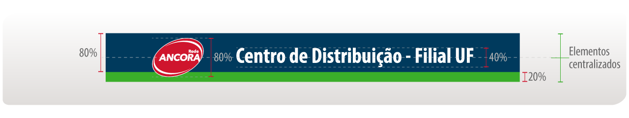 A testeira deve seguir rigorosamente o padrão visual da Rede ANCORA, utilizando o fundo azul institucional com faixa verde na base. O logotipo da Rede ANCORA deve estar posicionado no lado esquerdo, sobrepondo parcialmente a faixa verde. A direita, deve ser aplicado a identificação da filial (“Centro de Distribuição - Filial UF”) na cor branca, escrito com a fonte Myriad Pro Condensed Regular, com a primeira letra maiúscula e as demais minúsculas. Todos os elementos devem estar centralizados horizontalmente, respeitando as proporções e alinhamentos definidos para a marca.