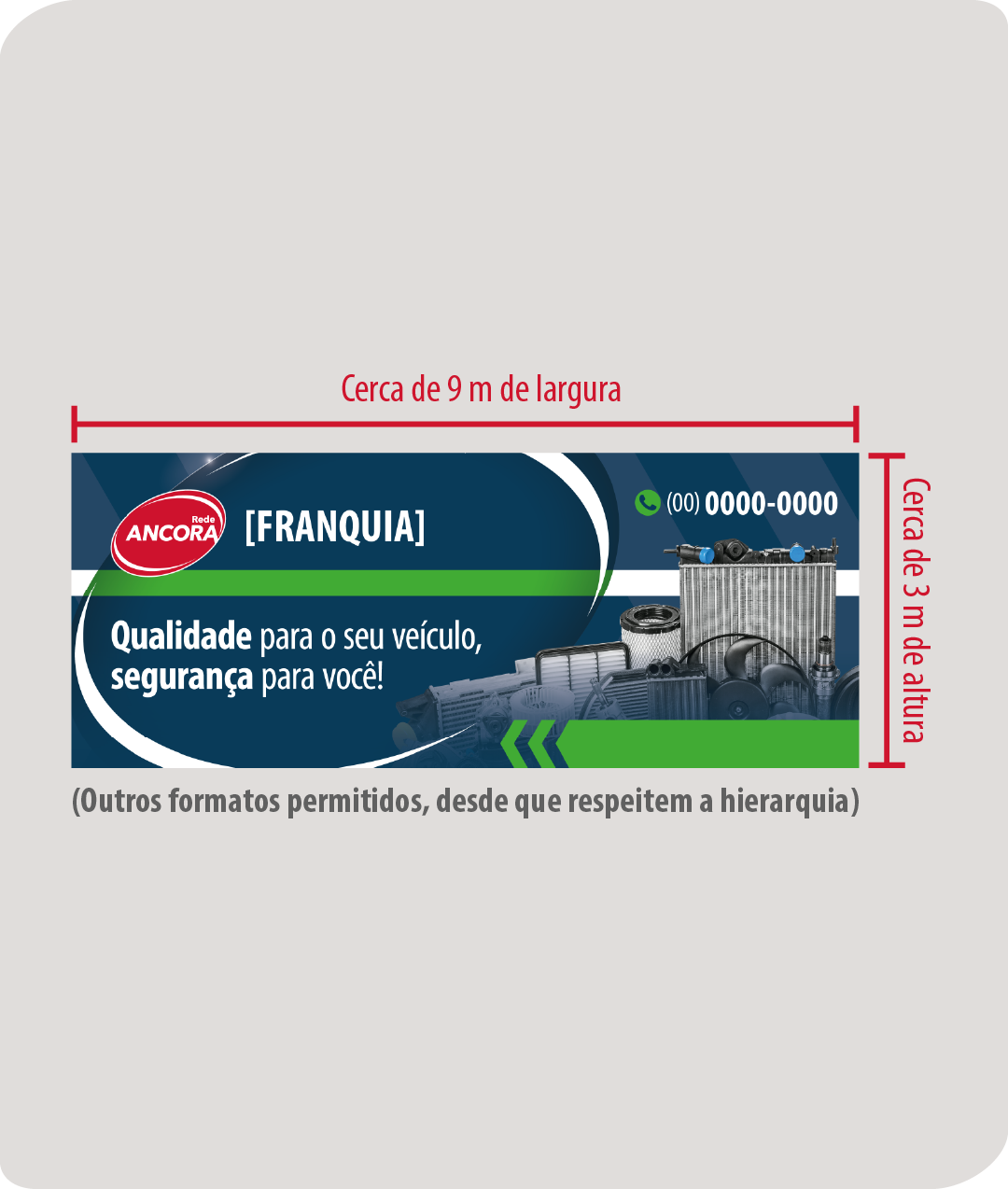 9 m (largura) x 3 m (altura) – outros formatos permitidos, desde que respeitem a hierarquia.